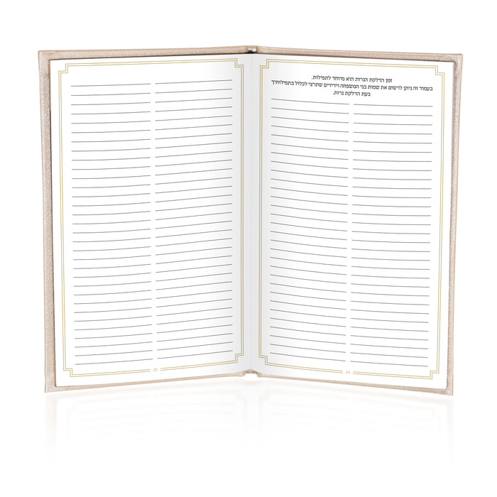 Elevate your Shabbos candle lighting with our Painted Leather Hadlokas Neiros Booklet. Featuring tefillos, brachos, and stunning painted pictures, it also includes space for personalized names to have in mind during davening. Our hardcover booklet is the perfect addition to your candle lighting rituals.