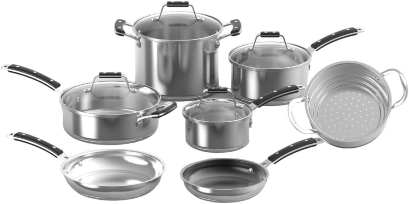 Introducing Cuisinart Heritage™ Stainless Collection! Inspired by our beginnings, we combined the traditional triple rivet handle design with our bestselling material, stainless. The stunning new handle is beautifully crafted with a matte black finish and brilliant stainless-steel rivets. The pieces in this collection are versatile enough to bring from oven to table and are dishwasher safe for quick and easy cleanup. Set includes 1.5 qt. saucepan with cover, 3 qt. saucepan with cover, 3.5 qt. sauté pan with helper handle and cover, 6 qt. stockpot with cover, 8″ nonstick skillet, 10″ skillet and steamer insert.