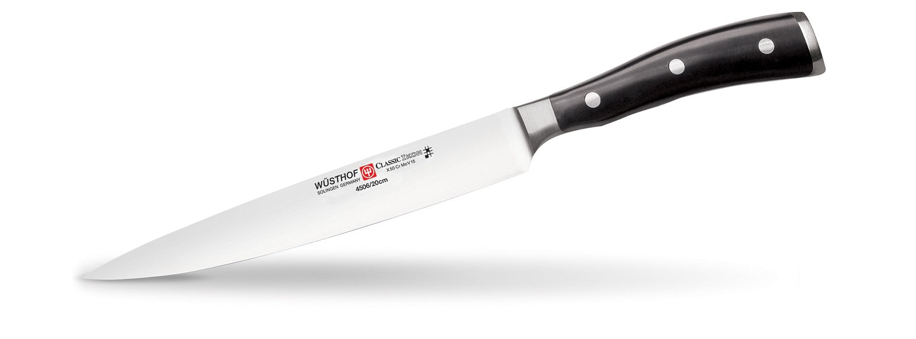 CLASSIC IKON knives feature a distinctive, double bolster design for professional-style heft, exceptional balance and beauty. The handle is made of a highly durable synthetic material – Polyoxymethylene (POM) – which has a tighter molecular structure to resist fading and discoloration. The elegant shape of the handle is designed for a comfortable grip. The CLASSIC IKON 9" Carving Knife has a longer and narrower blade than a Cook’s Knife. This allows for the knife to cleanly cut through meats. The pointed tip is designed to help guide meat away from the bone.